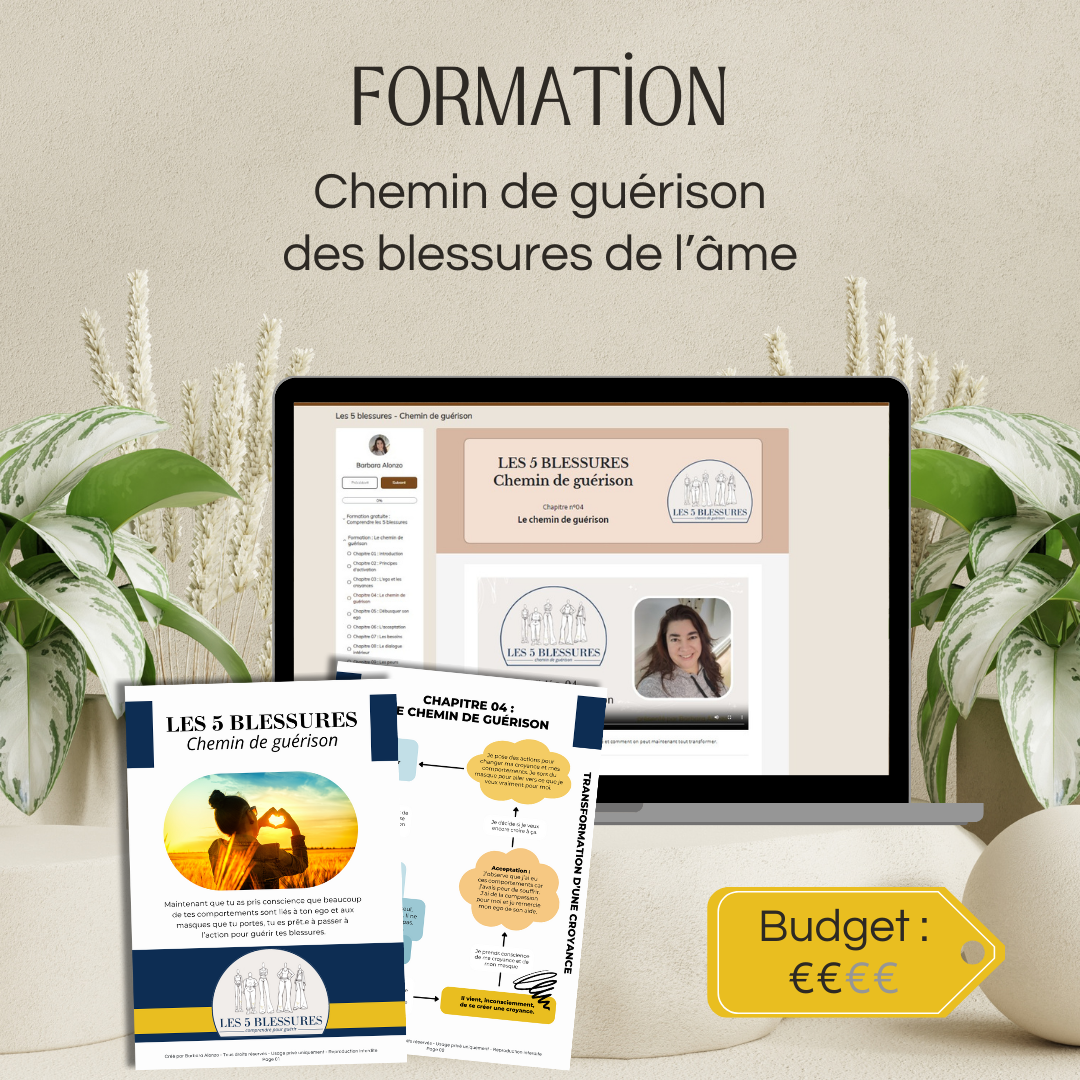 Chemin de guérison est la formation de base de mon catalogue et fait suite à la formation de 2h offerte pour comprendre les 5 blessures (lien pour en profiter).